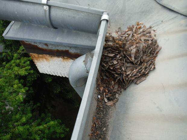 | Nadokapní žlaby bylo nutné vyčistit, okolní stromy ucpaly svod. | |||